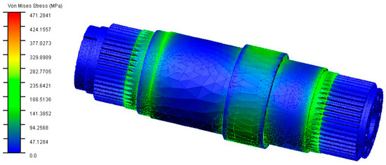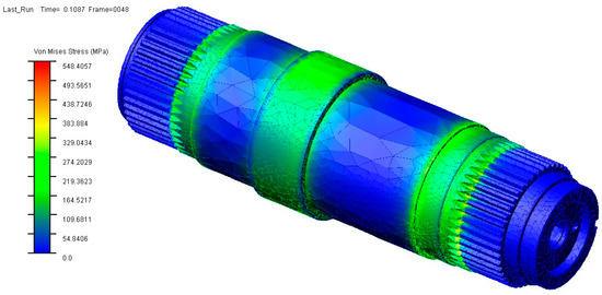 Figure 10 and Figure 11 show that the maximum load on the output shaft occurs at 0.1087 s, with significant fluctuations observed in the stress values. The maximum stress reaches 548.4057 MPa, resulting in a safety factor of 1.736 calculated from the yield strength of the shaft material. The point of maximum stress is located at the spline undercut groove connecting the output shaft to the low-speed, heavy-duty gear at the output end.