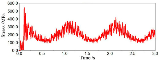 The obtained cutting pick load data was imported into ADAMS. Three-directional forces and three-directional torques were applied to each pick on the drum. The simulation time was set to 3 s, with a simulation step size of 0.001 s, and the Wstiff integrator was used to conduct the rigid-flexible coupled virtual prototype simulation of the shearer. The ADAMS post-processing module shows that the front-cutting unit experiences more severe loading conditions than the rear-cutting unit during operation in coal seams containing gangue; therefore, the front-cutting unit was selected as the primary object of study. The simulation results, including the stress contour of the output shaft and the curve of maximum stress points obtained through the ADAMS post-processing module, are illustrated in Figure 10 and Figure 11.