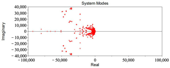Forced vibration characteristics of the shearer’s rigid-flexible coupled model were analyzed through ADAMS/Vibration. ADAMS’s load curves imported from the dynamic simulation were subjected to Fourier transformation, obtaining frequency–domain curves for vibration analysis. These frequency–domain curves, representing the load on the cutting picks, were added as external excitations in the Input Channel, with PSD selected as the excitation parameter, and applied at the tip of the cutting picks. According to the shearer’s rigid-flexible coupled dynamics simulation results, an output channel was established, and the note point at the maximum stress position on the output shaft was selected as the test point for displacement response vibration analysis. The simulation frequency was 0.001–50 Hz, with 2500 steps. The system modes obtained from the forced vibration simulation are shown in Figure 12, and the first 30 natural frequencies extracted from the system are listed in Table 3.