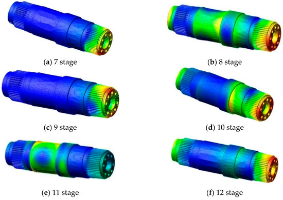 The real parts of the system modes shown in Figure 12 are all negative, indicating that the established rigid-flexible coupled model of the shearer has high stability. A comparison between the system modal in Table 3 and the output shaft modal frequencies in Table 2 provides a basis for vibration reliability research. The modal shape contours of the output shaft reveal that the modal shapes from the first to sixth orders are relatively stable. The modal shapes from the seventh to twelfth orders exhibit comparatively lower frequencies than other orders, and these low-frequency vibrations commonly result in failures during shearer operation. To illustrate the characteristics and patterns of the modal shapes, the modal shape contours of orders 7–12 are presented as examples in Figure 13.