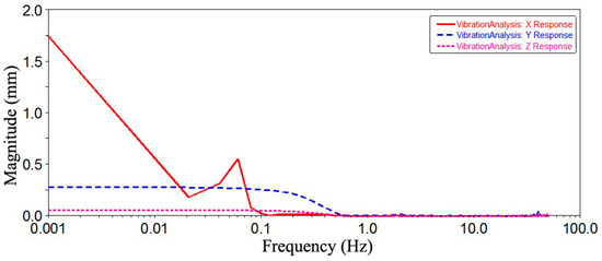 As shown in Figure 14, the displacement response curves of the test point on the output shaft display relatively high values within the low-frequency range of 0.001–0.1 Hz. The vibration of the critical component test point is the most severe in the X-direction, followed by the Y-direction, with the smallest amplitude observed in the Z-direction. The maximum displacement response value at the output shaft test point is 1.7515 mm. The dynamic simulation results from the rigid-flexible coupled virtual prototype align closely with the actual operating conditions of the shearer, providing essential data support for the reliability analysis of the output shaft.