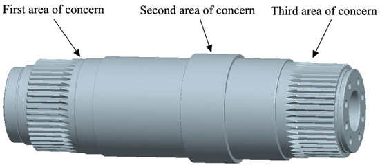 The rigid-flexible coupled simulation results for the output shaft indicate three regions of stress concentration, located, respectively, at the spline undercut groove where the output shaft meshes with the low-speed heavy-duty gear at the cutting unit output end; the shaft’s largest radial position; and the spline undercut groove at the connection between the output shaft and the square head of the cutting unit, as illustrated in Figure 15.