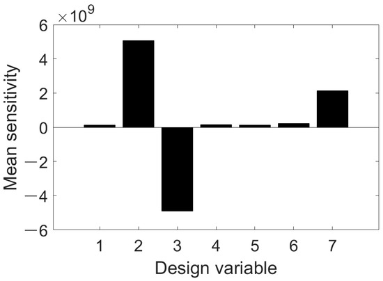 As shown in Figure 18, the dimensional normalized mean sensitivity numerical results for the design variables [Rza, Dza, Lza, Dzb, Lzb, Rzc, Lzc]T7×1 are [1.3395 × 108, 5.0558 × 109, −4.8939 × 109, 1.5315 × 108, 1.2226 × 108, 2.1416 × 108, 2.1294 × 109]. The normalized sensitivity values reflect the relative influence of design parameters on system reliability. A positive value indicates that reliability improves as the parameter increases, while a negative value suggests the opposite. Larger absolute values correspond to more significant impacts. The mean increases in the undercut groove radius Rza, diameter Dza, diameter Dzb, length Lzb, undercut groove radius Rzc, and spline length Rzc lead to a more reliable output shaft, while the increase in the mean of length Lza reduces the output shaft’s reliability. Among the design variables, the diameter Dza has the largest impact on the reliability of the output shaft’s correlated failure modes, while the length Lzb has the smallest impact. These analysis results provide the basis for the optimization design of the output shaft.