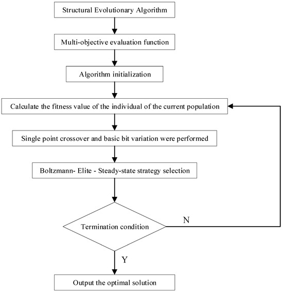 Based on the Rastringin function, a hybrid strategy combining Boltzmann selection, elitist strategy, and steady-state strategy is chosen. Single-point crossover is employed for the crossover operation, and basic-bit mutation is selected as the mutation method within the structural evolution algorithm to solve the optimization problem [26]. The procedural flowchart of the structural evolution algorithm is shown in Figure 19.