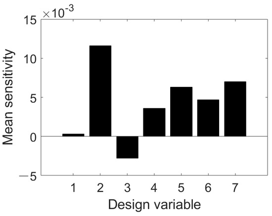 As shown in Figure 21, the optimized mean sensitivity results of the design variables [Rza, Dza, Lza, Dzb, Lzb, Rzc, Lzc]T7×1 are [0.0003, 0.0116, −0.0028, 0.0036, 0.0063, 0.0047, 0.007]. Compared to the sensitivity analysis results before optimization presented in Figure 18, the absolute sensitivity values decreased after optimization, indicating that the influence of these design variables on output shaft reliability has diminished. After optimization, the reliability of the output shaft increased from 0.6047 to 0.9860.