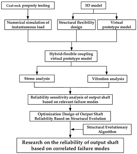 To investigate the vibration reliability of the output shaft in the cutting section of a shearer under coal seams containing hard gangue inclusions, this study focuses on the “MG400/951-WD” shearer model and conducts physical–mechanical parameter testing on coal seam samples with gangue inclusions. A rigid-flexible coupling reliability analysis method considering correlated failure modes is proposed for critical shearer components. This methodology integrates field sampling tests, rigid-flexible coupling virtual prototyping technology, reliability design theory, resonance failure theory, and reliability sensitivity theory to systematically study the reliability of the output shaft under coal seam conditions containing gangue inclusions. The technical roadmap of the research methodology is illustrated in Figure 24.