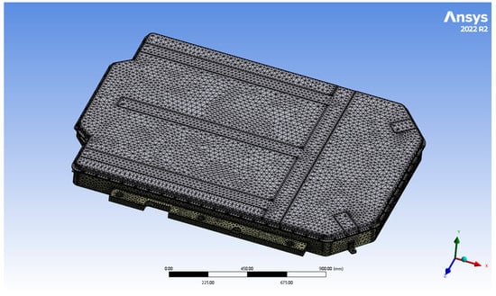 In this study, a partitioned mesh strategy is adopted to discretize the battery pack model, and an optimal balance of accuracy and computational efficiency is achieved in ANSYS Workbench: a 12 mm fine mesh is used for critical stress concentration areas such as bolt joints and reinforcing bar intersections, and a 15 mm coarse mesh is used for low stress areas such as planar housings. A mirrored mesh technique is used to ensure consistency in the node pattern of the symmetric features. This method reduces the total number of nodes by 22% (334,534) and ensures that the maximum stress change is less than 3% (see Section 3.5 for details of the validation), which significantly improves the solution efficiency while maintaining the computational accuracy (Figure 4).