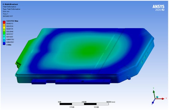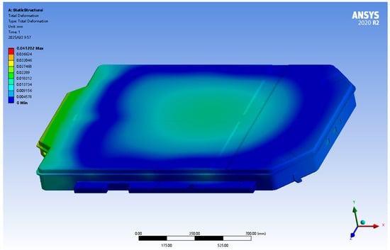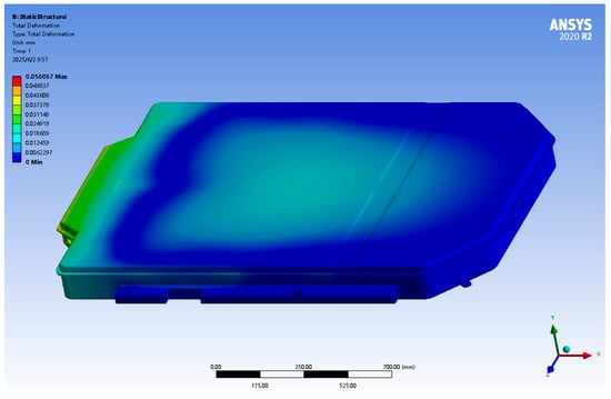 Through ANSYS Workbench analysis of emergency braking conditions on uneven road surfaces, the results of the displacement and stress maps from the battery pack shell finite element simulation are shown in Figure 12 and Figure 13.