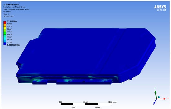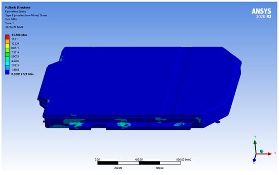 The stress map analysis results for the emergency left-turn working condition, as shown in Figure 7, indicate that the stress group is concentrated on both sides of the fixed bracket and box link, where the maximum stress position is 13.59 MPa, which is less than the battery pack material Q235 yield strength of 235 MPa. In the other areas, the stress values are lower, and in line with the performance specifications, meeting the strength requirements of the battery pack.