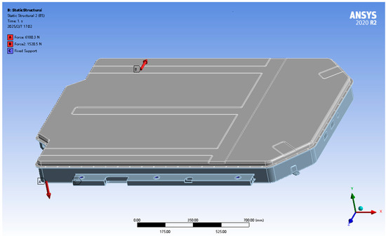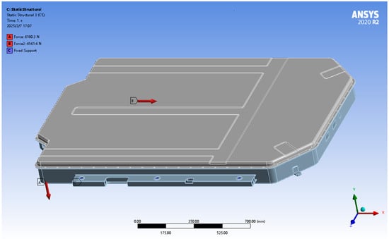 Setting loading load: after inputting the parameters into the formula calculation, it is learnt that a force of 6180.3 N is applied vertically downward at the admissibility of the lower case of the battery pack and the battery module, and at the same time, a force of 4561.6 N is applied at the front part of the battery pack, as shown in Figure 11.