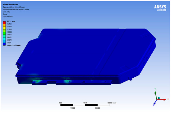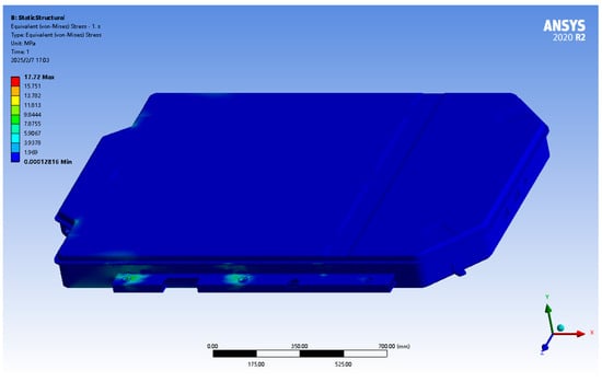 From the emergency braking conditions stress map analysis results shown in Figure 21, it can be seen that the stress group is concentrated on both sides of the fixed bracket and the box link, where the maximum stress position is 17.72 MPa, which is less than the yield strength of the battery pack material ZL104 190 MPa. In other areas, the stress values are lower, in line with the battery pack performance specifications to meet the strength requirements.