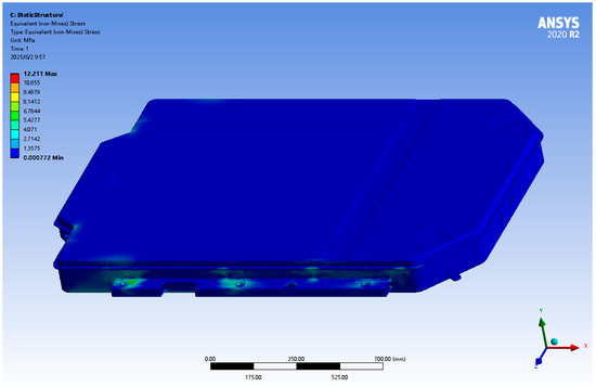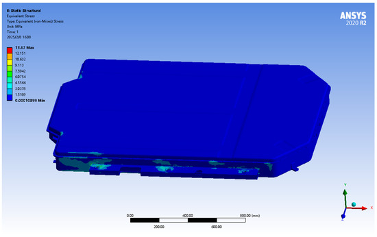 From the emergency braking conditions stress map analysis results shown in Figure 13, it can be seen that the stress group is concentrated on both sides of the fixed bracket and the box link, where the maximum stress position is 12.21 MPa, which is less than the battery pack material Q235 yield strength of 235 MPa. In other areas, the stress values are lower, in line with the battery pack performance specifications and requirements.