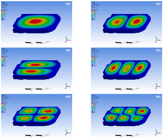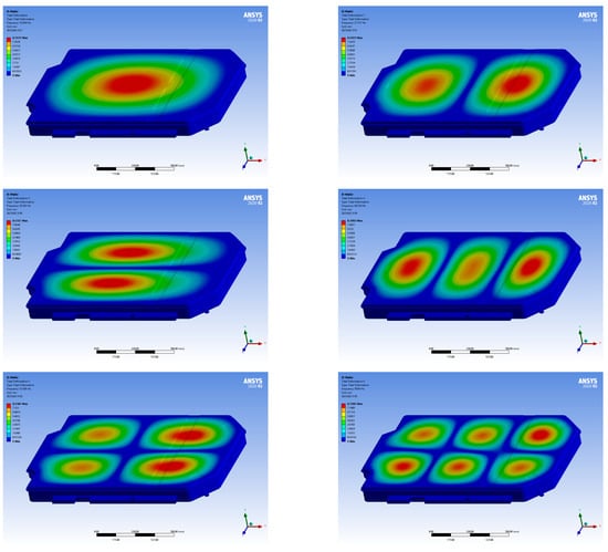 By performing the modal analysis of the battery pack shell, as shown in Table 5 and Figure 22, we obtained detailed information about its intrinsic vibration frequency. The analysis results show that the intrinsic frequency range of the battery pack shell is distributed between 16.76 Hz and 71.44 Hz. At lower frequencies, the main vibration mode of the battery pack shell is dominated by vertical bending deformation, and with the gradual increase in frequency, the shell begins to show the coupling of vertical bending and torsional deformation. Considering the vehicle in the actual driving process, the vibration frequency caused by an uneven road surface is usually concentrated in the low-frequency range of 0 to 10 Hz. In this analysis, the first-order modal intrinsic frequency is 16.76 Hz, while the rest of the modal frequencies of each order are significantly higher than this value. This means that the intrinsic frequency of the battery pack shell deviates significantly from the vibration frequency range that the vehicle is likely to encounter during driving. This design effectively avoids the risk of resonance of the battery pack structure during driving, thus providing a strong guarantee for the smoothness of vehicle driving and the safety of the battery pack. In conclusion, the results of the modal analysis show that this design effectively avoids the possibility of resonance of the battery pack shell during actual operation and ensures the dynamic stability of its structure.