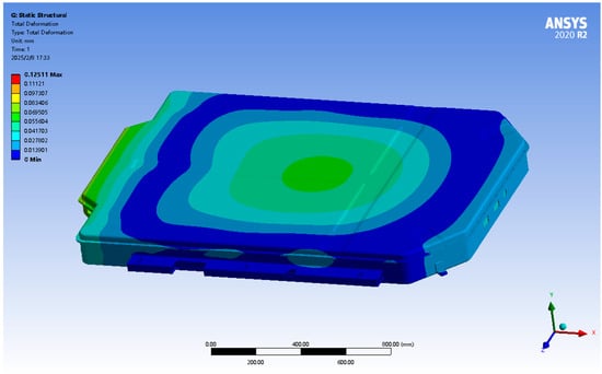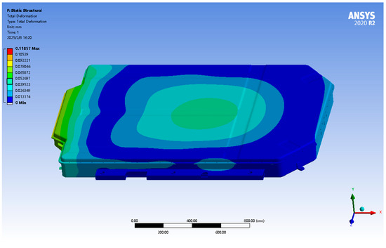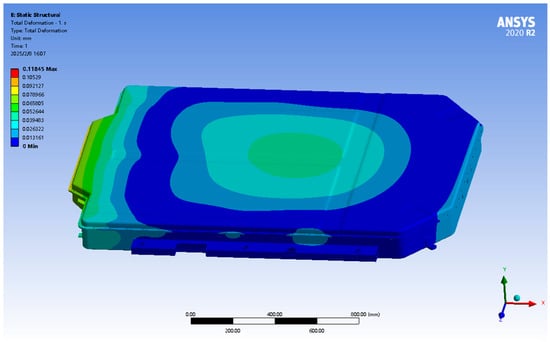From the analysis results of the emergency braking condition displacement cloud diagram in Figure 20, it can be seen that the battery pack shell displacement deformation mainly occurs in the center and the tail. The maximum deformation occurs in the battery pack shell tail position, measuring about 0.12 mm, which is far less than the national regulation limit of 6 mm, which is determined to meet the steel strength requirements.