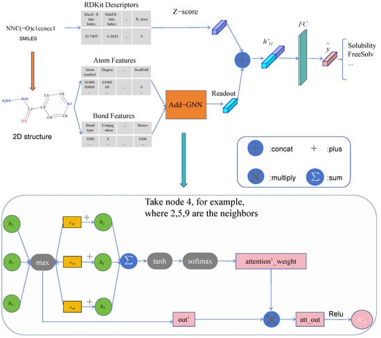So, in this paper, we proposed a GNN model with additive attention (Add-GNN). Molecular graphs can effectively mine the structural information in molecules, while molecular descriptors can more comprehensively represent molecules in various aspects, such as the physical structure, chemical structure, and topological structure [,]. By combining them, we can represent the molecules more comprehensively and increase the accuracy of molecular property prediction. Second, in the message-passing phase, we designed an additive attention mechanism to better fuse the information of neighboring nodes and edges. We know that in a molecular graph, each node is connected to its neighbors through edges, so neighboring nodes and edges also carry a large amount of useful information. By fusing them, we can capture the hidden structural information in molecules more fully and strengthen the representation of molecules. Finally, we applied the L2-norm to calculate the importance of the predictions for each atom in each molecular graph and then defined different colors for visualization according to the importance level. In order to clarify how the model works, interpreting the model is also an important task. By using the L2-norm to calculate and visualize the contribution of each atom to the predicted results, we are able to clearly see which atoms play an essential role in influencing molecular properties. This interpretable approach is important for the practical application of molecular property prediction models. It can help chemists and drug developers to better understand model predictions, identify key molecular structures, and develop new drugs.