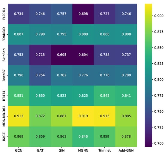 To show the results of the models more clearly, in Figure 2, we plot the heatmaps of all models on the classification dataset. The darker the color of the square corresponding to each model, the better the performance of the model, as can be seen from the figure, Add-GNN achieves better performance on most of the datasets.
