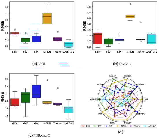 Figure 3a–c are boxplots of the performance of all models on the regression dataset. It is clear from the figure that the median of Add-GNN is smaller, indicating better performance of Add-GNN. In addition, the smaller box length of Add-GNN indicates that the number distribution is more uniform and there are no outliers, which further indicates the excellent performance of Add-GNN. Figure 3d is a radar plot of all model rankings, from which it can be seen that the Add-GNN enclosure has the smallest area, indicating that Add-GNN is competitively ranked on almost all datasets.