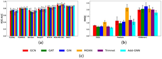 As can be seen in Table 3, our dataset is divided into classification and regression problems. For classification problems, we use the area under the receiver operating characteristic curve (ROC-AUC) to evaluate the performance of the model, and for regression problems, we use the root-mean-square error (RMSE) to evaluate the performance of the model. We compare a graph-based baseline approach (GCN [], GAT [], and GIN []) and two state-of-the-art methods (Meta-MGNN [] and TrimNet []) to validate the performance of Add-GNN. In our experiments, all the datasets are randomly split into training, validation, and test sets with a split ratio of 8:1:1. We evaluate Add-GNN with five different random seeds and use the average of the five results as the final result, all results are after hyperparameter optimization.
