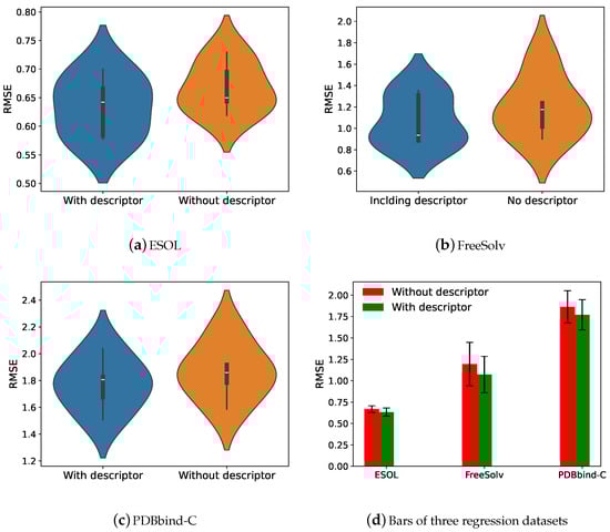 Figure 5 demonstrates the effect of adding molecular descriptors on model performance. As can be seen from Figure 5a–c, the median of the violin plots is smaller and the width is narrower after the addition of the molecular descriptor, indicating that descriptors significantly improve model performance. From Figure 5d, it can be seen more clearly that the root-mean-square error of the model ground is smaller after the addition of the molecular descriptor, which again shows that the molecular descriptor is crucial to the performance improvement of the model.