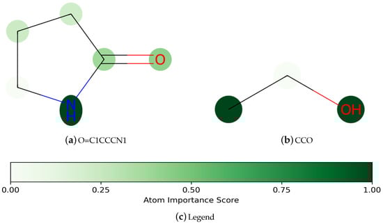 The performance of the model is important, and also the interpretability of the model is equally important. Deep learning models are often viewed as a black box, and in practice, we need to know not only the predictions of the model but also which structures in the molecule have influenced the model’s results []. In this paper, inspired by Zhang et al. [], we compute the L2-norm of each atomic feature as an importance score. We used the ESOL water solubility dataset to analyze the interpretability of Add-GNN.