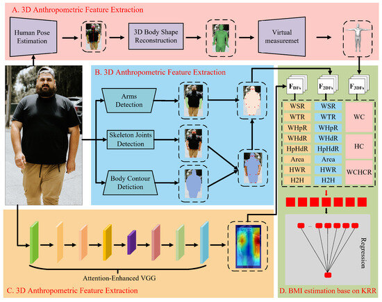Body Mass Index (BMI) is a commonly used indicator to measure the degree of obesity, classifying people as underweight, normal weight, overweight, or obese [1,2]. In recent years, research focused on the prediction of BMI has attracted increasing attention. Traditionally, BMI is obtained by measuring an individual’s height and weight. However, this method may encounter multiple challenges due to the physical limitations of certain patients. To address this issue, vision-based BMI measurement methods have emerged as a viable solution [3]. Previous studies have proposed predicting BMI based on facial images by analyzing the relationship between facial features and BMI [4,5,6]. Xiang et al. [7] proposed a three-dimensional deep model named STNet for visual BMI estimation. However, compared to 2D body images, clear facial images are generally more challenging to obtain due to privacy protection concerns. In addition, BMI prediction based on facial images also faces certain accuracy challenges. To overcome these challenges, some researchers have turned to using 3D human body data or RGB-D images to calculate BMI [8,9]. Although these methods can estimate BMI with reasonable accuracy under certain conditions, the acquisition of RGB-D images is highly sensitive to sunlight exposure and measurement distance, making it difficult to obtain high-quality 3D human body data in outdoor environments.