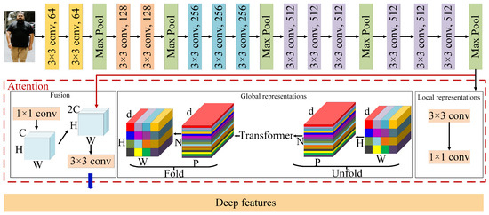 Deep feature extraction employs VGG as the backbone network, which has been shown to significantly improve performance in image classification, object detection, and segmentation [44]. In this study, an attention-enhanced VGG model is proposed to extract deep features, as shown in Figure 3. The proposed model in this study is based on the VGG model and incorporates the MobileViT attention mechanism [45], enhancing the network’s focus on important image regions and improving its feature extraction capability. The MobileViT attention mechanism works by selectively emphasizing informative features while suppressing less relevant ones. This selective focus allows the model to better understand the spatial relationships between different parts of the body, which is crucial for accurate BMI estimation from body images.