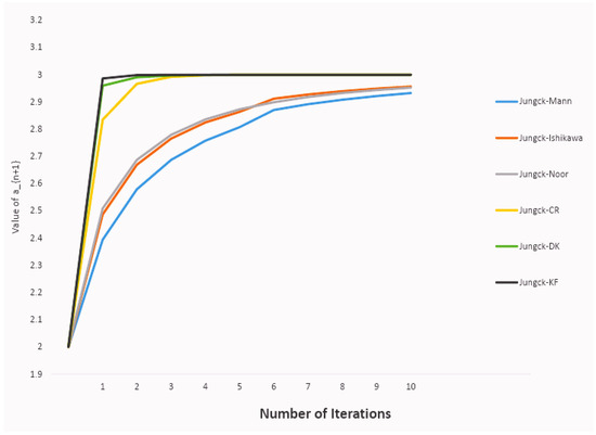 The following theorem is devoted to studying the convergence behavior of the proposed Jungck-KF iteration in relation with the Jungck-DK iteration and other iterations. It is noteworthy that among all Jungck-type iterative methods, the Jungck-KF scheme is recognized for achieving a superior rate of convergence.