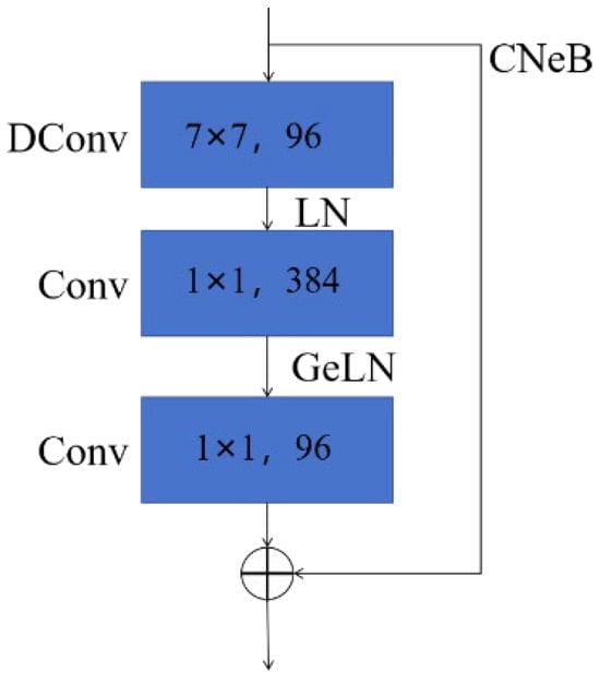 For an input feature map X from a downsampling layer, CNeB contains two branches. In the main branch, a 7 × 7 depthwise convolution is applied, followed by layer normalization. Two consecutive 1 × 1 convolutions are then used—one activated by a GELU function, the other followed by layer scaling. A Drop Path operation is applied for regularization, and the output is aggregated with the original features.