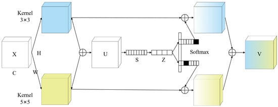 The vector Z is passed through a softmax function to predict the channel-wise attention weights ac and bc for different-scale feature maps U1 and U2. These weights are used to perform channel-wise weighted aggregation, producing the final feature representation V, as described in Equations (7)–(9). This process enhances essential features while suppressing irrelevant information.