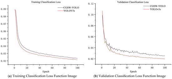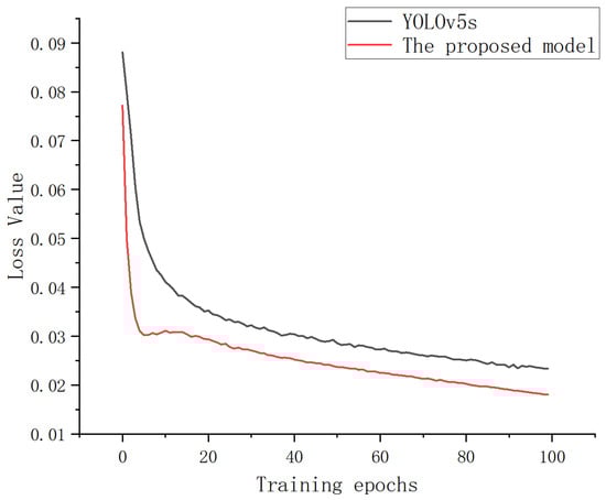 To validate the effectiveness of the improved loss function, we compared it with the original YOLOv5s model (Figure 6). After approximately 40 iterations, the loss function tended to stabilize, and the model reached its optimization. As shown in Figure 6, the loss value of the proposed model decays faster, and the final minimum loss is lower compared to the model before optimization. This indicates that the DGFW-IoU loss function significantly enhances the model’s convergence speed.
