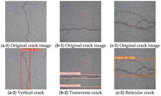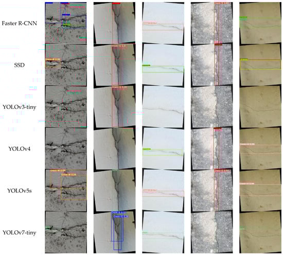 Figure 9 presents the detection results for three different types of concrete structure cracks: transverse cracks, vertical cracks, and mesh cracks. For each crack type, the figure shows the detection results of seven different models: Faster R-CNN [21], SSD [22], YOLOv3-tiny [23], YOLOv4 [24], YOLOv5s [25], YOLOv7-tiny [26], and YOLOv8 [27].