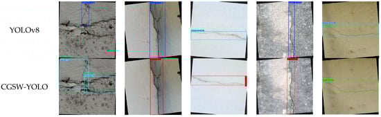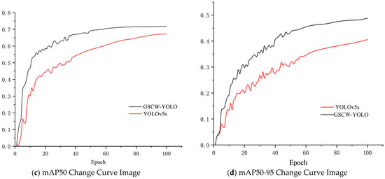 Figure 10 compares the training curves of the original YOLOv5s model and the improved GSCW-YOLO model in terms of the loss function, mAP50, and mAP50-95. As shown in subfigures (a) and (b), the GSCW-YOLO model exhibits faster convergence and significantly improved training stability compared to YOLOv5s. In subfigures (c) and (d), the mAP50 and mAP50-95 curves of the improved GSCW-YOLO are clearly higher than those of YOLOv5s. The GSCW-YOLO algorithm not only provides high-precision detection results for concrete structural cracks but also demonstrates strong accuracy and robustness in detecting fine cracks. It effectively meets the practical demands for efficiency and accuracy in crack detection under various environmental conditions. This offers strong technical support for quality monitoring and maintenance of concrete structures and holds significant value for advancing the health assessment of concrete structures in the construction industry.