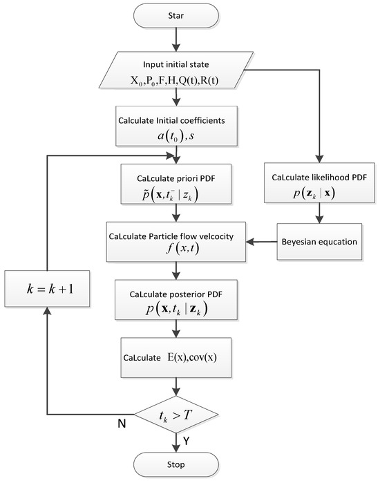 The Bayesian estimation method based on particle flow velocity (PFV-BEM) is a state estimation method that approximates the PDF of the state. First, the prior PDF of the state is calculated within the projection space. Second, the particle points of the prior PDF are obtained through calculating the particle flow velocity, and the particle information of the posterior PDF can be obtained. Finally, the estimated solution and estimated variance of the system state can be calculated. Therefore, PFV-BEM is an effective method for solving Bayesian estimation problems. The flowchart of the PFV-BEM algorithm is shown in Figure 1.