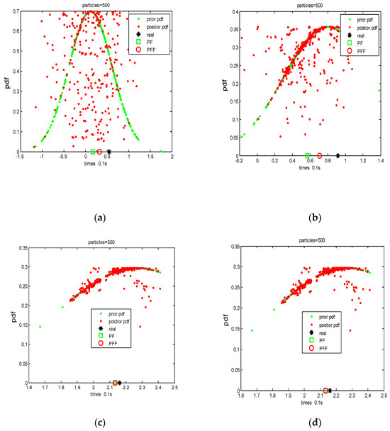 The comparison results of prior and posterior probability density functions under different time intervals, as well as the actual information and the estimation results obtained from the two filtering algorithms. The black asterisks represent the actual position information, the green squares denote the estimation results of the Particle Filter (PF) algorithm, and the red circles indicate the estimation results of the PFV−BEM filtering algorithm. (a) Display state estimation information result at t = 0.1 s, (b) display system state estimation information result at t = 1 s, (c) display system state estimation information result at t = 1.5 s, (d) display system state estimation information result at t = 2 s.