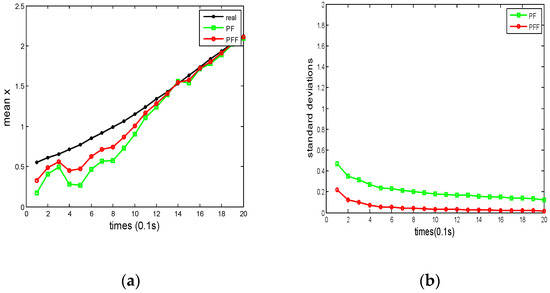 The simulation time is T = 2 s, and the number of particles is 1000. The estimated results are shown in Figure 2 and Figure 3. The priori PDF and posterior PDFs are plotted in Figure 2. The normalized density functions are plotted every other 0.1 s. The partial results have been shown in Figure 2, where the actual position information (represented by black stars), PF estimated position information (represented by green squares), and PFV-BEM estimated position information (represented by red circles) are all displayed in Figure 2. The approximate particle flow in the PDF of the state is shown through the four graphs in Figure 2. Figure 3 provides a comparison chart of the estimated mean and variance of the two algorithms, where the PF estimation error is represented by a green line and the PFV-BEM estimation error is marked by a red line.