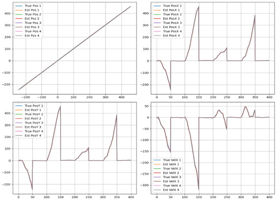 For the trajectory tracking model of four targets, the state estimation results based on the Particle Filter (PF) and the Particle Filter-based variational Bayesian estimation method (PFV-BEM) are presented in Figure 4, Figure 5 and Figure 6. Figure 4 displays the state estimation results of the four targets based on PFV-BEM, including a comparison between the actual position information of the four targets and the position estimates obtained using the proposed algorithm, as well as a comparison between the actual velocity information of the targets and the velocity estimates derived from the PFV-BEM algorithm. Figure 5 shows a comparison of the position estimates of the four targets obtained using both the PF and PFV-BEM algorithms. Figure 5 also presents the velocity estimation results of the four targets based on PF and PFV-BEM. Additionally, Figure 6 illustrates the position and velocity error estimation results of the four targets tracked using the two algorithms. Here, the estimation errors of PF are represented by blue lines, while those of PFV-BEM are represented by orange lines.