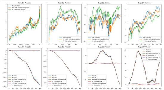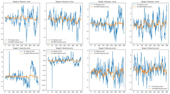 Figure 4, Figure 5 and Figure 6 present partial experimental results obtained using the Particle Filter (PF) algorithm and the PFV-BEM algorithm. From Figure 4, it can be seen that the PFV-BEM algorithm can acquire the position and velocity tracking information of four targets. When compared with the actual information of the targets, it shows favorable tracking results. The experimental results indicate that the PFV-BEM algorithm can effectively track the changes in the system state, fully verifying the feasibility of the algorithm. Figure 5 displays the estimation results of the position and velocity information of the four targets, respectively. The experimental results show that, compared with the PF algorithm, the PFV-BEM method exhibits higher accuracy and can well address the state estimation problem in nonlinear systems. Figure 6 provides the error estimation results for tracking the four targets. The experimental results demonstrate that the PFV-BEM method has high estimation accuracy. Evidently, for high-dimensional nonlinear systems, the PFV-BEM algorithm functions as an effective Bayesian estimation method for tackling the state estimation problem.