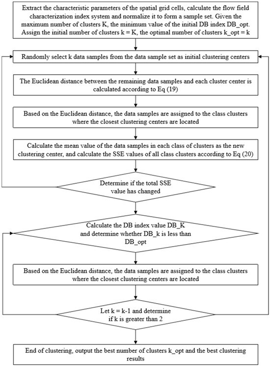 28], the Davies–Bouldin (DB) index exhibits lower sensitivity to outliers and isolated points under high-dimensional and multi-cluster conditions, effectively reducing the interference of extreme samples on clustering evaluation results and ensuring the stability and reliability of clustering outcomes. In particular, when dealing with large-scale, high-dimensional, strongly heterogeneous, and complex-flow reservoir grid flow field feature datasets, the DB index can objectively and accurately measure the compactness and separation of clustering partitions. It provides a robust criterion for assessing the objectivity, rationality, and scientific validity of flow field partitioning results in highly heterogeneous reservoirs during the high water-cut stage.
