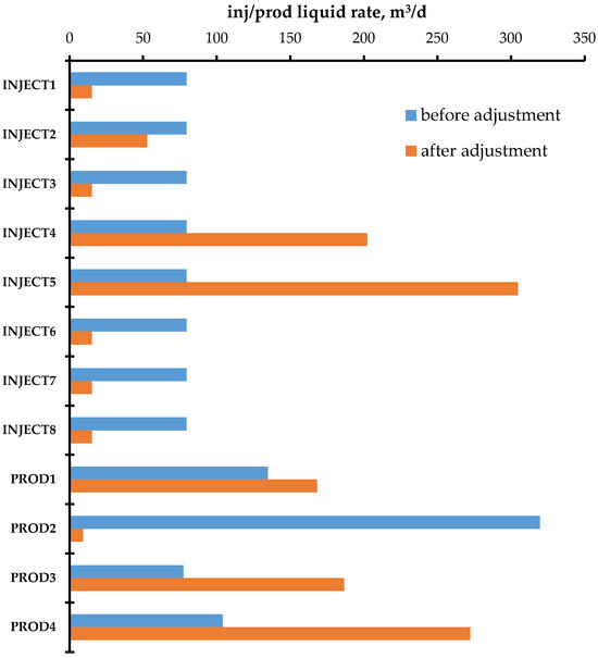 Figure 6. The figure shows that the water injection wells adopted a unified working strategy before the adjustment. After the injection and production parameter optimization countermeasures were adopted, the water injection wells in the area with a large local flow field intensity were liquid controlled, and the water injection of wells in the area with a large local flow field potential was increased. The same goes for the oil production wells.