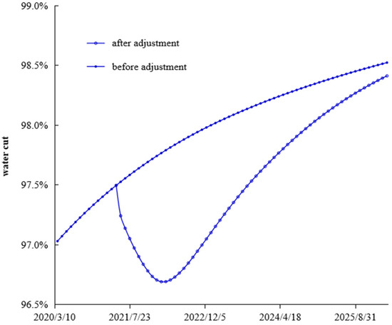Figure 7 shows a comparison of the comprehensive water content of the model after simulating production for 5 years before and after the flow field adjustment. After the flow field of the reservoir was adjusted during the ultra-high water-cut period, the development effect was significantly improved, the comprehensive water content decreased significantly, and the recovery factor increased by 1.1 percentage points.