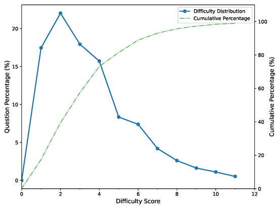 - Defining Problem Difficulty Scores: We define problem difficulty scores as a cumulative function of theorem weights, where the initial application of a theorem contributes its base weight, and repeated applications incur progressive penalties, increasing by 0.1 with each recurrence. This penalty mechanism accounts for the cognitive load accumulation effect in complex reasoning processes. The precise formula for calculating the difficulty score D is as follows:where denotes the weight of theorem i, and represents the number of times theorem i appears, with .
