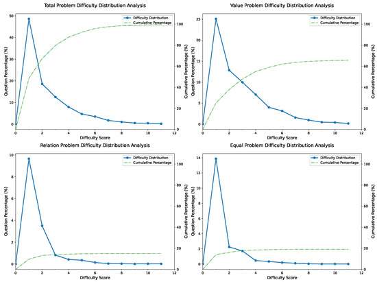 For difficulty stratification, the FormalGeo30K dataset’s difficulty coefficient distribution, derived from the FGeo-Eval evaluation system, is shown in Figure 3. The figure illustrates both the overall difficulty distribution and the difficulty distributions for problems targeting the predicates Relation, Value, and Equal, respectively. Statistical analysis reveals that calculation problems, as indicated by the predicate Value, demonstrate higher average difficulty coefficients, yet they still conform to the overall difficulty distribution of the dataset. Among these, the problems corresponding to MeasureOfAngle and LengthOfLine, which represent calculations of angles and line lengths, account for the largest proportion of computational problems, at 49.4% and 31.4%, respectively. This pattern is similarly reflected in a subset of proof problems denoted by the predicate Equal, with proportions of 44.5% and 33.9%, respectively. In contrast, for problems concerning the properties and relationships of geometric entities represented by the predicate Relation, the inherent complexity of geometric relationships leads to a more diverse distribution of problem types. Notably, the proof problems corresponding to the predicate RightTriangle for right-triangle determination and the predicate PerpendicularBetweenLine for proving parallel relationships account for relatively high proportions, at 16.8% and 16.1%, respectively.