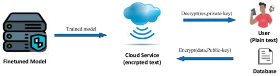 Figure 2 describes the encryption process of fully homomorphic encryption. We deploy a pre-trained language model, such as ALBERT, to the cloud. The pre-trained model receives encrypted ciphertext from the database, which has been encrypted with a public key, and performs inference operations  on the ciphertext. Finally, the encrypted result is returned to the user, who decrypts it using a private key. Throughout the entire workflow, the cloud model does not have access to the plaintext data or the prediction results, thereby ensuring privacy and confidentiality.