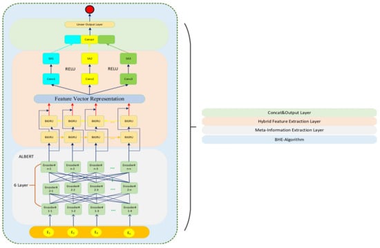 To maintain the high performance of the hybrid model while significantly reducing the number of parameters and the computational resources required, we employed the ALBERT model in the meta-information extraction layer. ALBERT shares parameters across different encoder layers rather than using distinct parameters for each layer, as illustrated in Figure 5.