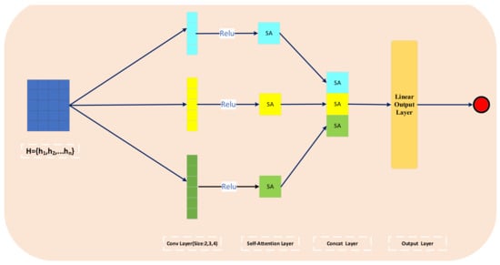 Relu is the nonlinear activation function, and  and  are the weight parameter matrices. Finally, the attention features from each convolutional channel are hybrid into the feature representation embedding . The concatenation of the attention feature hybrid embedding from multiple convolutional channels is shown in Equation (14).