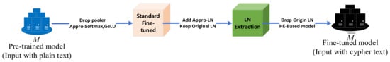 The symmetrical approximation workflow consists of two phases: standard finetuning and LN extraction, as illustrated in Figure 7. Given an original ALBERT-Mixplus Model that has not undergone HE approximation, denoted as , through fine-tuning with educational evaluation data, a fully HE-supported  is generated. The two-phase objective of Algorithm 1 is to identify the best approximation checkpoint.