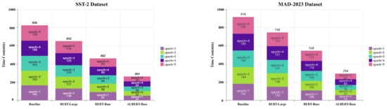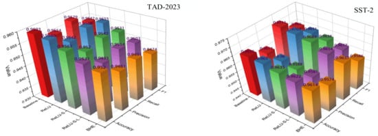 Based on the experimental results presented in Figure 9, the baseline model demonstrates an improvement in accuracy metrics of 2.27% and 1.57% over the ALBERT model on the SST-2 and TAD-2023 datasets, respectively. This indicates the positive contribution of the functional components within the ALBERT-Mixplus hybrid feature extraction layer. Specifically, the MCNN-MCO component has a significant impact on the performance of the hybrid model. This effect is evident both in single-variable and dual-variable ablation experiments, highlighting that the multi-scale convolution kernels in the MCNN-MCO model are effective in extracting features at different granularities, thereby contributing substantially to the model’s performance.