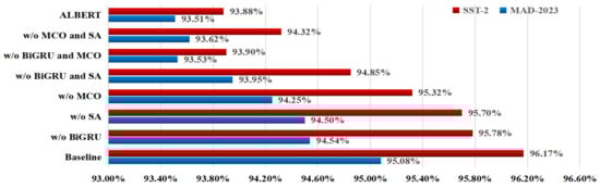 In the previous section, we validated the positive impact of the BHE algorithm on the ALBERT-Mixplus model. In this section, we will conduct ablation experiments to further assess the contributions of each functional component within the hybrid feature extraction layer under the support of the BHE algorithm. Using the same hyperparameters as in the previous experiments, we will compare the effects of the BiGRU, MCNN-MCO, and MCNN-SA components. The results for the accuracy metric are illustrated in Figure 10.
