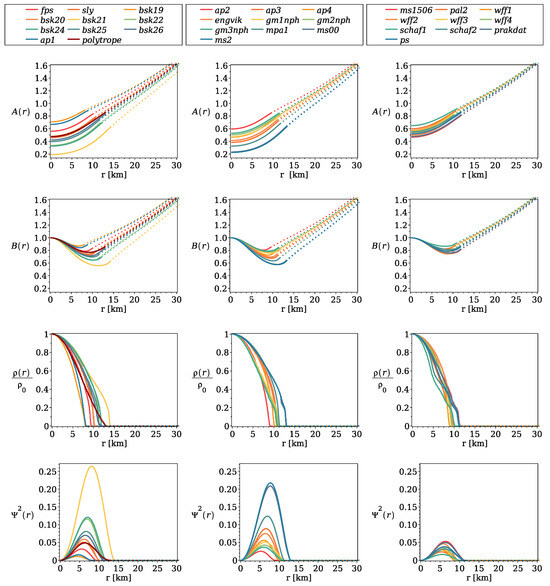 The typical behavior of functions , , and inside and outside the star is shown in Figure 1 and Figure 2. Figure 1 shows the r dependence of this functions in the case km and the central baryonic mass density for different equations of state. For convenience, 31 equations of state were divided into three groups. Each column of the figures shows functions for this set of equations of state. The correspondence between the curve color and the equation of state is clarified in the legends at the top of the figure. The solid line corresponds to the internal solution, the dotted line corresponds to the external vacuum solution. The internal and vacuum solutions are continuously glued at the boundary of the star . The matter density monotonically decreases and equals zero at the boundary of the star. The solution of equals zero outside the star as well. As already mentioned, in the case where , the vacuum solutions of and coincide, but the internal solutions differ.