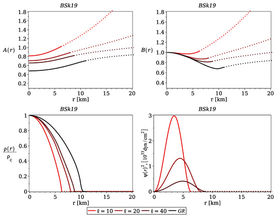 Despite the diversity of equations of state, many conclusions will be common for each of them. Therefore, we will consider one illustrative example to demonstrate these common properties. Next, we chose BSk equations only for the sake of demonstrativeness. Figure 2 shows the r dependence of the functions , , and in the case of the BSk19 equation of state, and , 20 and 40 km. The correspondence between the curve style and ℓ is given in the legend; the black curve corresponds to the unmodified theory of gravity (GR). As the parameter ℓ increases, the curves shift towards to the unmodified solution (GR), the scalar field tends to zero, and the radius of the star increases. Other equations of state have a similar appearance.